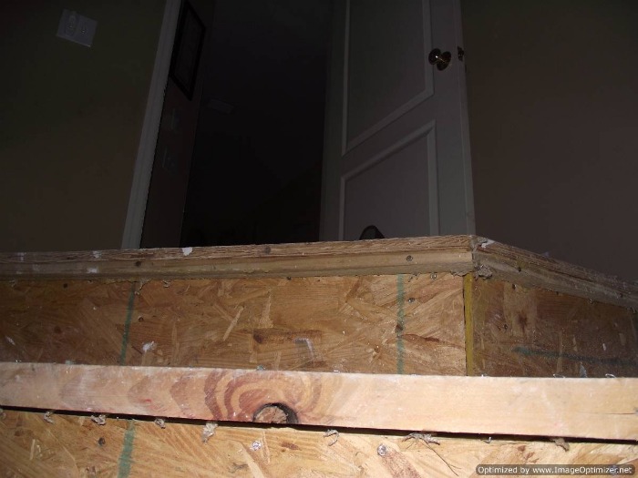 In this case I am showing a two step drop down leading into the master bedroom. These steps were originally covered with carpet. The carpenters were not too concerned about how plumb or level these steps turned out, knowing they would be covered with carpet.