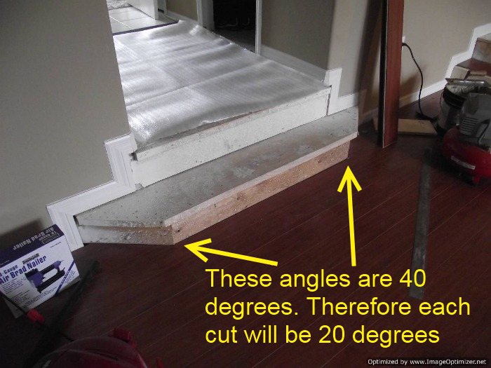 In this case the angles on this step are 40 degrees each. So when cutting the stair parts such as the risers and stair noses, Each cut (in this case it will be 20 degrees each) needs to equal the total of the angle. This will result in a tight fit when the pieces are installed.